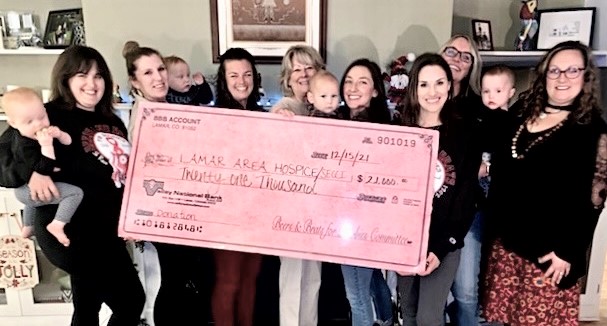 Members of the BBB, Beers and Brats for Boobies Committee recently presented a check for $16,000 to the Lamar Area Hospice Group, part of $21,000 raised in the past year, of which the balance, $5,000 is being presented to SECCI, Southeast Colorado Cancer Initiative.