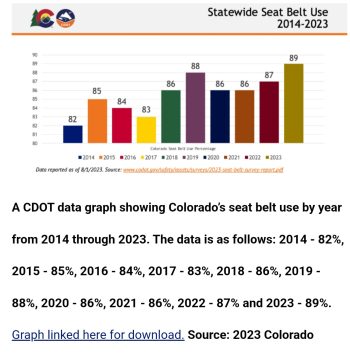 “Most Coloradans are doing the right thing by wearing a seat belt,” said CDOT’s Office of Transportation Safety Director Darrell Lingk. “Buckling up is the law. It also protects you from the extreme forces of a crash. Whether you’re the driver or a passenger, be sure to wear a seat belt and encourage others to do the same.”