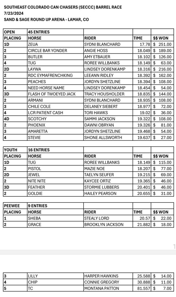 SE Colorado Can Chasers Barrel Race Results July 23, 2024