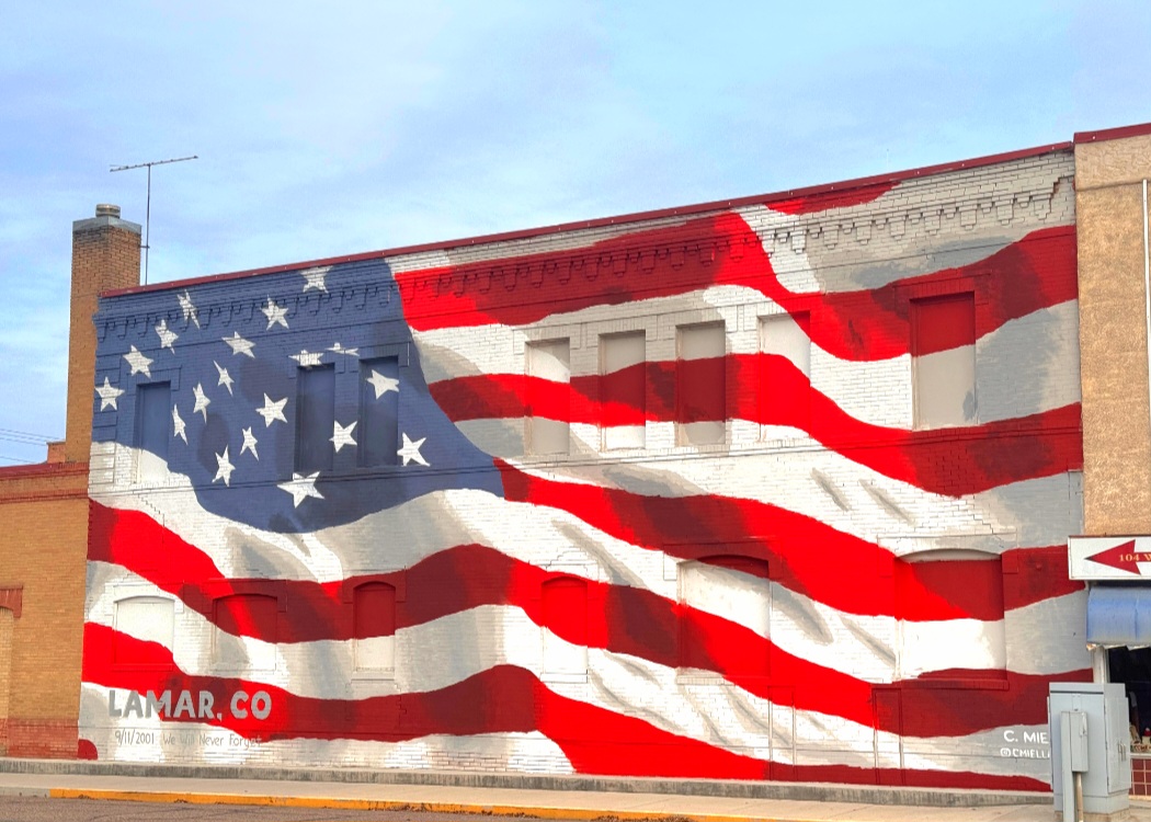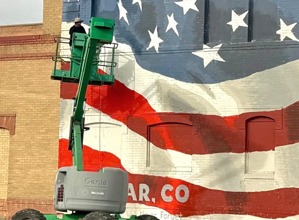 The mural was painted by Cody Miell of La Junta, Colorado, whose vision transformed the building into a bold, flowing tribute to the American flag. During the initial phase of the project, unforeseen technical issues with the paint sprayer forced the artist to adapt on the fly. Instead of spraying, the mural had to be completed by hand, using rollers and brushes, an impressive feat given the scale of the wall. That change in approach led to an unexpected paint shortage, leaving the mural just short of full completion.